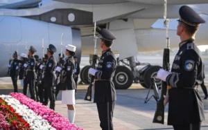 «Шығыс» әуежайында мәртебелі мейманның келуіне орай Құрмет қарауылы сап түзеді.