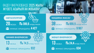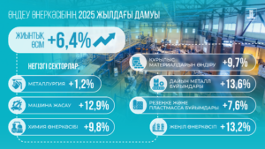 Қазақстан Республикасының Президенті Қасым-Жомарт Тоқаевтың өңдеу өнеркәсібін дамыту, экономиканы әртараптандыру және инвестиция тарту жөніндегі тапсырмаларын жүзеге асыру шеңберінде 2025 жылы негізгі салаларда тұрақты өсім қамтамасыз етілді.