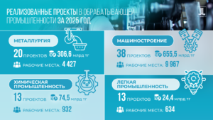 В 2025 году в отрасли реализовано 20 инвестиционных проектов с общим объемом инвестиций 306,6 млрд тенге, создано 4 427 рабочих мест.