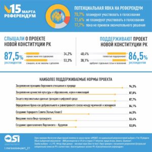 Опрос Института общественной политики демонстрирует высокий уровень информированности населения о проекте новой Конституции Республики Казахстан. На вопрос анкеты «Слышали ли Вы о проекте новой Конституции Республики Казахстан?» в совокупности 87,5% респондентов ответили, что в той или иной степени знакомы с документом: 34,2% сообщили, что хорошо знают его содержание, еще 53,3% слышали о проекте, но не знакомы с деталями. Вместе с тем 12,5% опрошенных заявили, что ничего не слышали.
