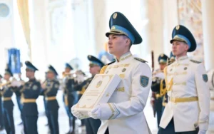 Құрмет қарауылы Қазақстан Республикасының жаңа Конституциясын салтанатты түрде ортаға алып шыққан соң еліміздің Әнұраны орындалды.
